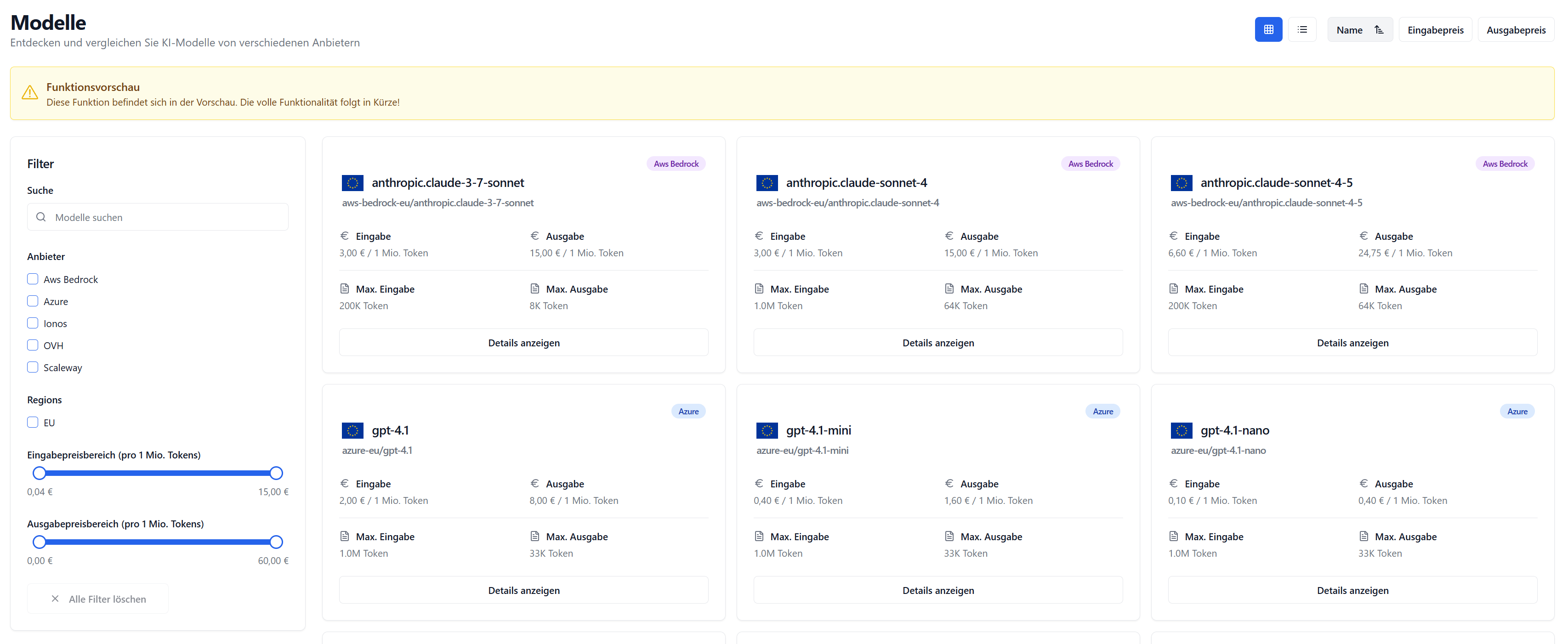 - Modellkarten: Jede Karte zeigt den Modellnamen, den Anbieter, den Preis pro 1 M Token (Eingabe/Ausgabe), die maximale Tokenanzahl und einen Link zu weiteren Details.
