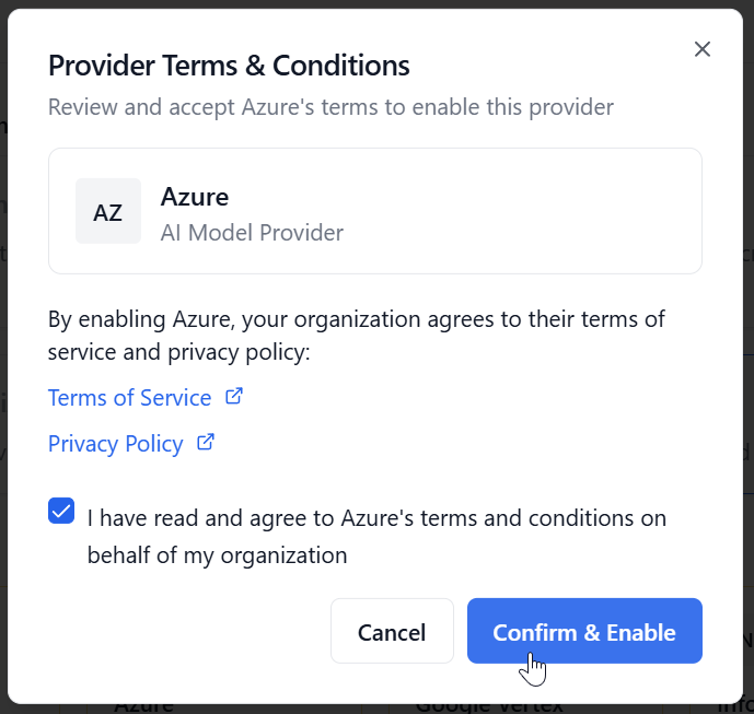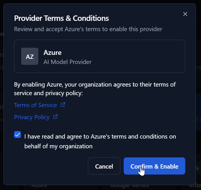 Providers marked in yellow with the label Consent required indicate that you have not yet accepted the provider's terms of service and privacy policy. However, this is necessary, to be able to assign providers. To do so you need to click on any given provider to open the consent dialog and accept the documents after you have read them.