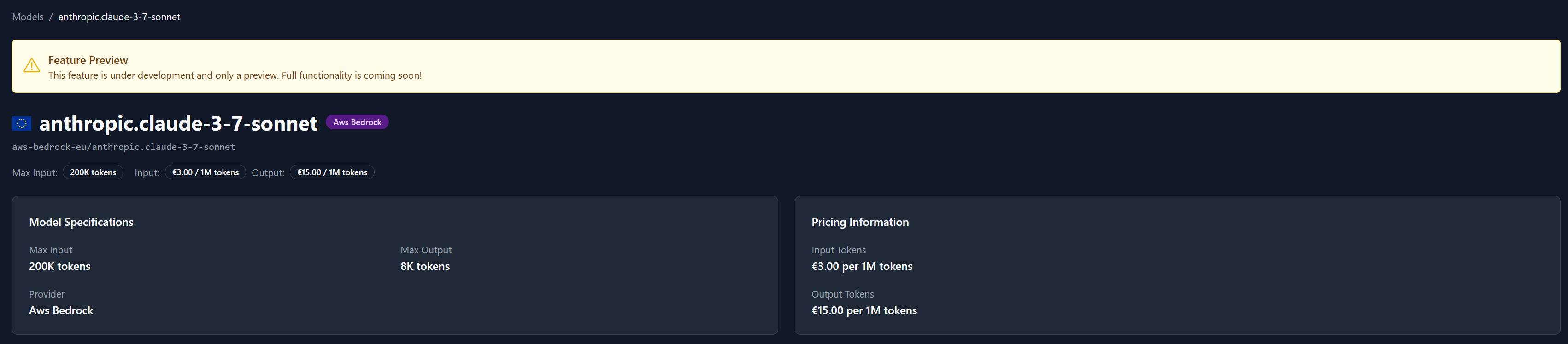 The "Models" page provides a clear overview and comparison of AI models from different providers. You can search for models, apply filters, and compare prices and technical details at a glance.